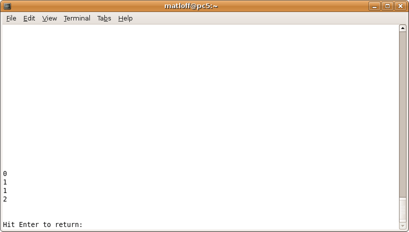 Since something is to be printed, PuDB takes us back to the shell command line: