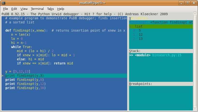 So, let's run our code under PuDB. To do this, we type