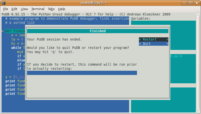 We could now run the code in a separate window to see if it works, but we can do that from within PuDB. First restart, using the process we discussed above, resulting in this screen: